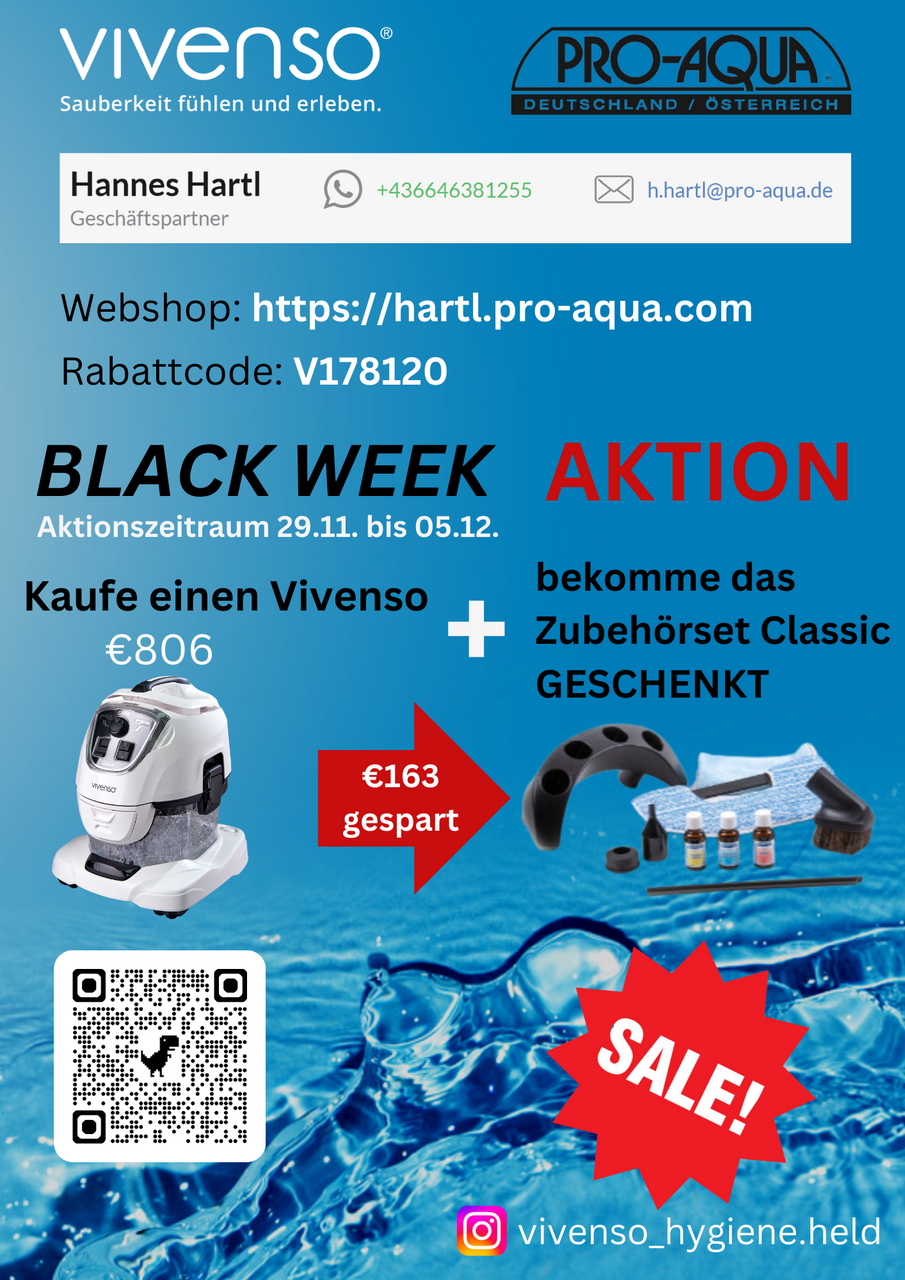 BLACK WEEK 2024 bei Pro-Aqua Kaufe einen Vivenso im Aktionszeitraum 29.11 - 05.12. und erhalte GRATIS das Zubehörset Classic dazu. Mit dem Rabattcode V178120 erhältst du zusätzlich 3% Rabatt auf die Artikel im Warenkorb.